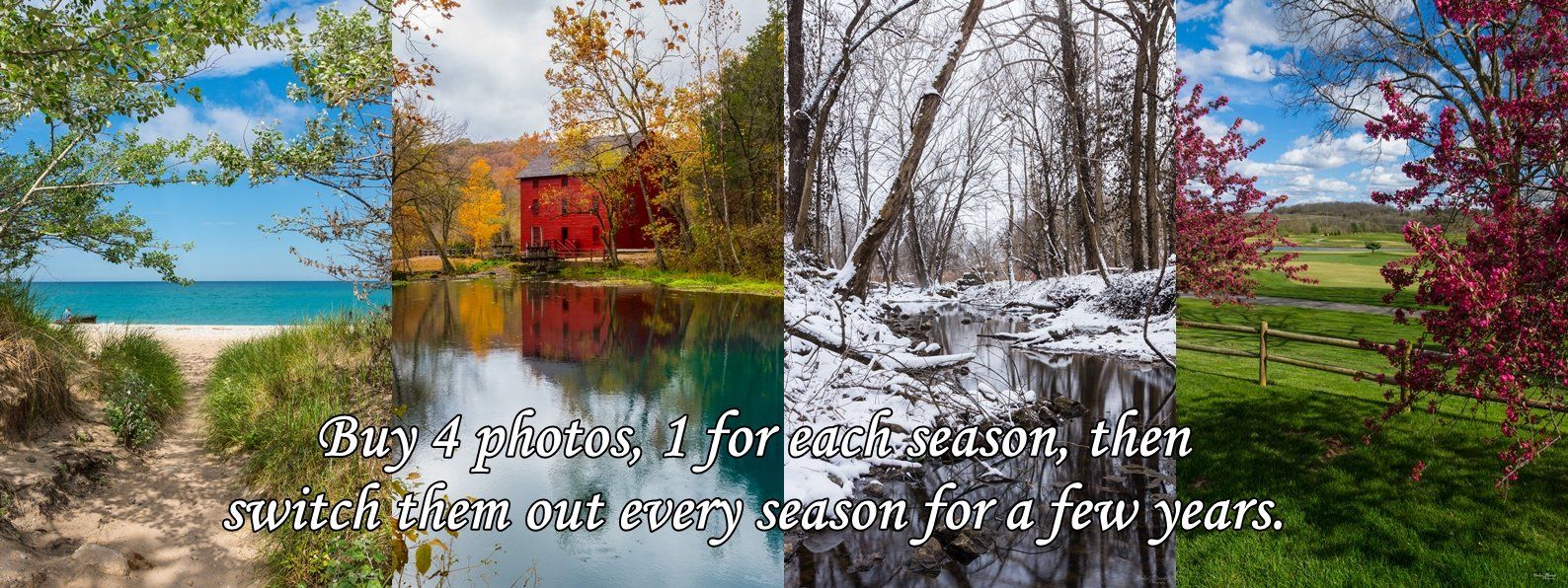 Then for each season, move them around. For example, during the summer, you can have a summer image in the Living Room. Then when autumn arrives, switch out the photo for the autumn one and move the summer one to the spot the autumn one was at. It's a great way to keep you from getting bored from looking at the same photo all the time. We like to do this in our home. I usually put the latest season that has just passed in the room that's less used. So if it's spring, I move the winter image to a guest bedroom and move the others around also. There are many possibilities but it's pretty simple and can be done on a budget.
